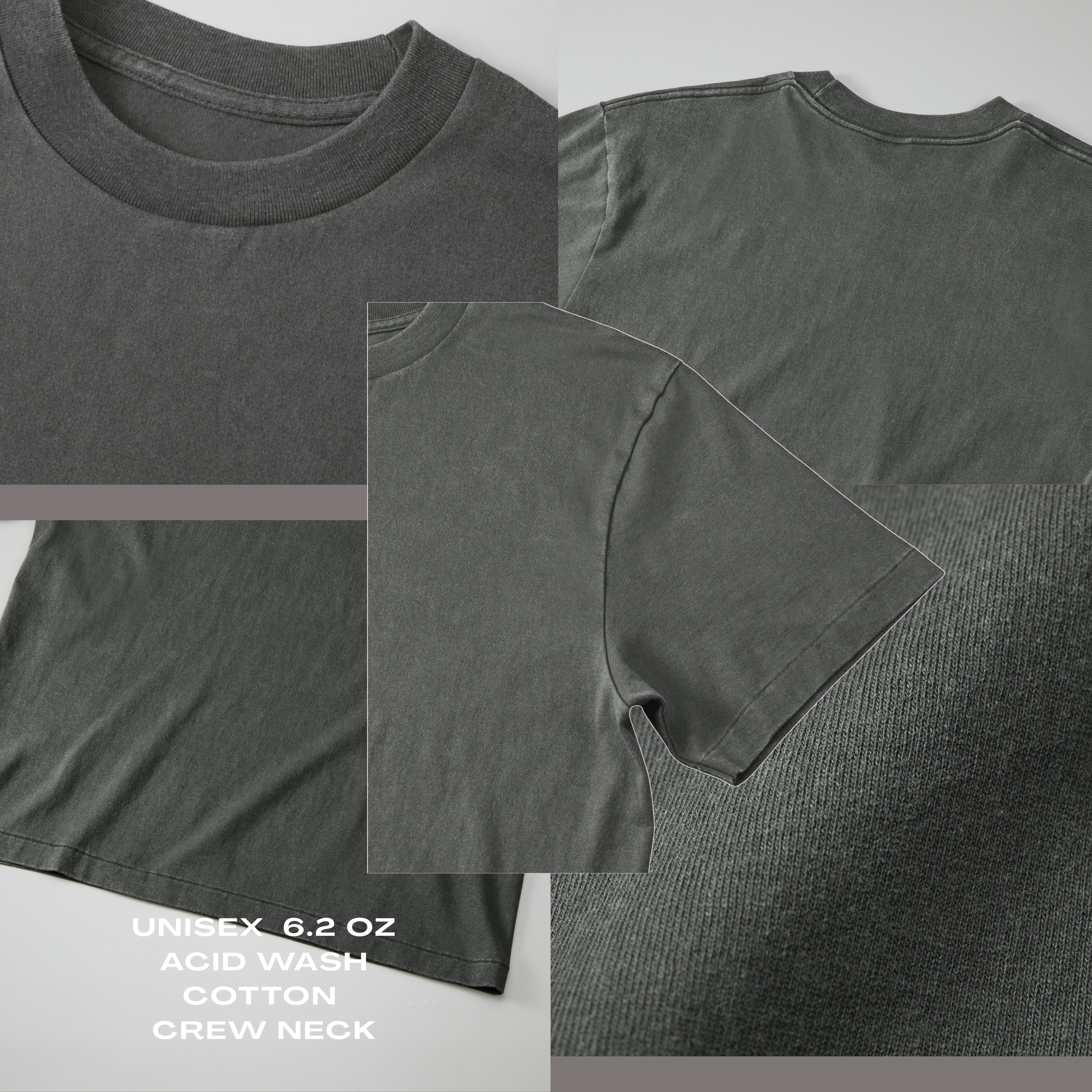 A 6.2 oz acid wash tee blending vintage ’80s–’90s character with modern comfort. Crisp open-end yarn and clean details make it ideal for bold graphics or standalone style.